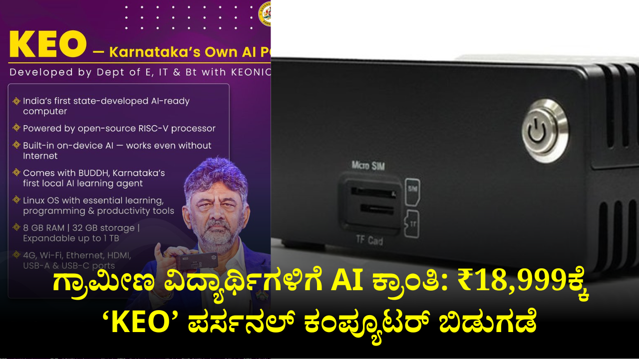ಗ್ರಾಮೀಣ ವಿದ್ಯಾರ್ಥಿಗಳಿಗೆ ಡಿಜಿಟಲ್ ಶಿಕ್ಷಣವನ್ನು ಕೈಗೆಟುಕುವಂತೆ ಮಾಡಲು Government of Karnataka ಮಹತ್ವದ ಹೆಜ್ಜೆ ಇಟ್ಟಿದೆ. ರಾಜ್ಯ ಸರ್ಕಾರ ಮತ್ತು KEONICS ಸಹಯೋಗದಲ್ಲಿ ‘KEO’ (Knowledge-driven, Economical, Open-source) ಎಂಬ ಹೊಸ ಮೈಕ್ರೋ ಪರ್ಸನಲ್ ಕಂಪ್ಯೂಟರ್ ಅನ್ನು ಬಿಡುಗಡೆ ಮಾಡಲಾಗಿದೆ.